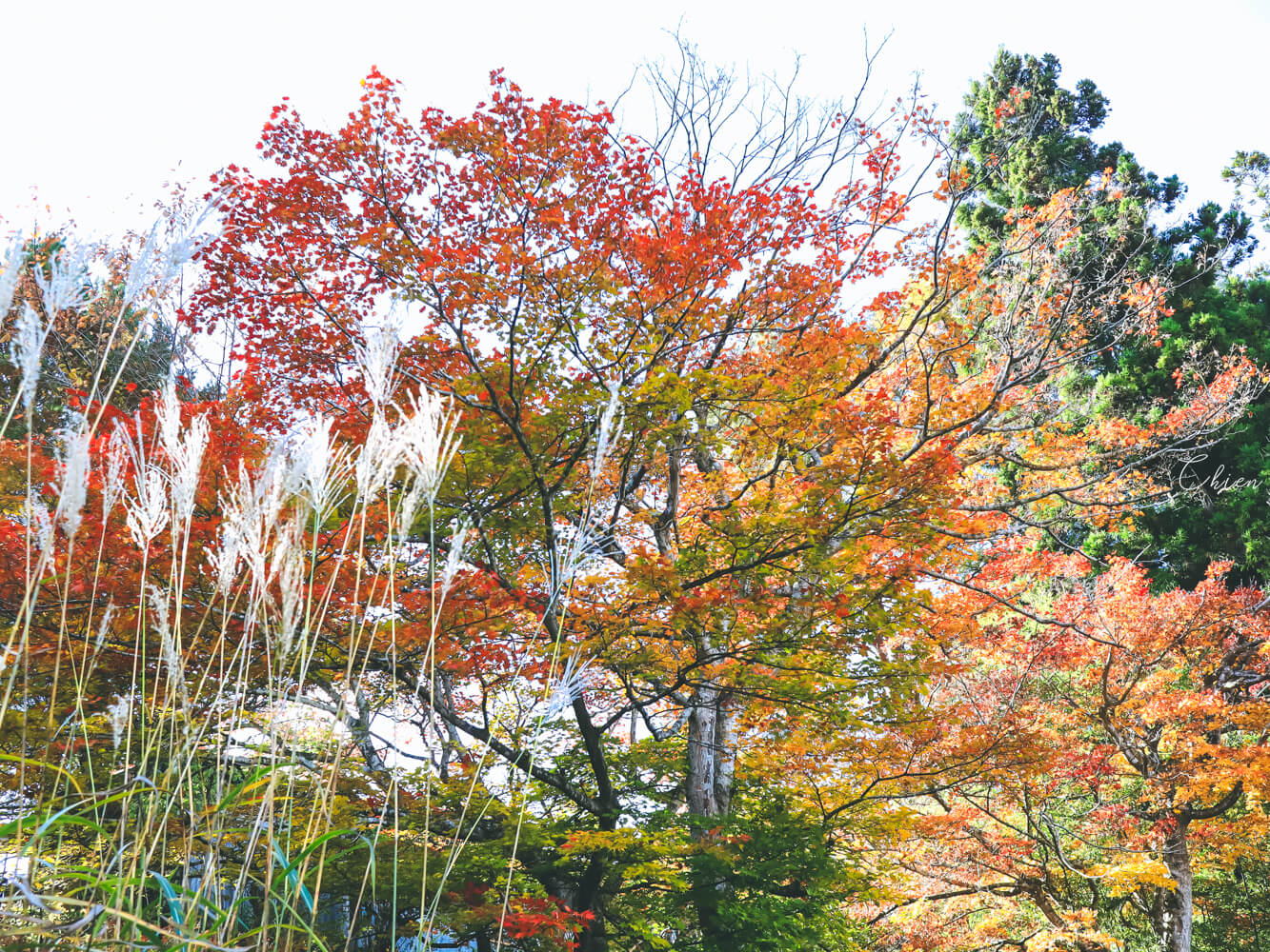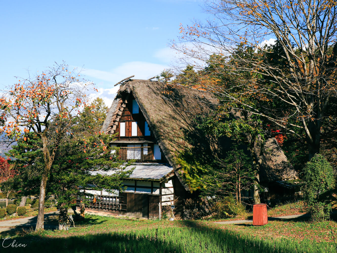 這次我們是自駕前往,飛驒之里備有停車場,小型車停車費為 300 日圓。一下車就看到停車場上方的樹木,刷上綠黃橙紅漸層色彩,不禁開始感到興奮期待。
