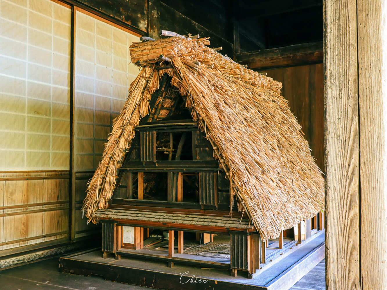 由於飛驒北部地區冬季經常下雪,當地居民在寒冷嚴峻的生活環境中,聰明地想到運用茅草具備抗雪的特性,設計出適合寒冷氣候的屋頂結構。不只如此,走入屋內更能透過展示解說,了解當地居民面對嚴冬所激發出的智慧。