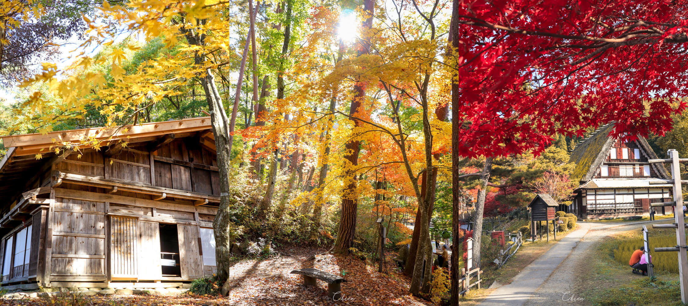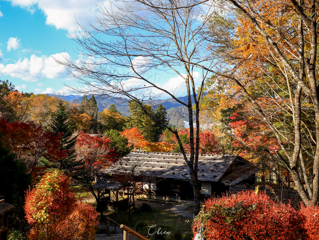 在高山的旅途中,正逢秋高氣爽的秋季,因此想帶家人到附近的賞楓景點走走。上網搜尋之後,發現位於高山市區附近的「飛驒之里」(飛騨の里),因此便決定帶著沒有在日本賞楓過的家人,到這裡欣賞岐阜地區特有的合掌村文化建築,順便拍照欣賞紅葉。