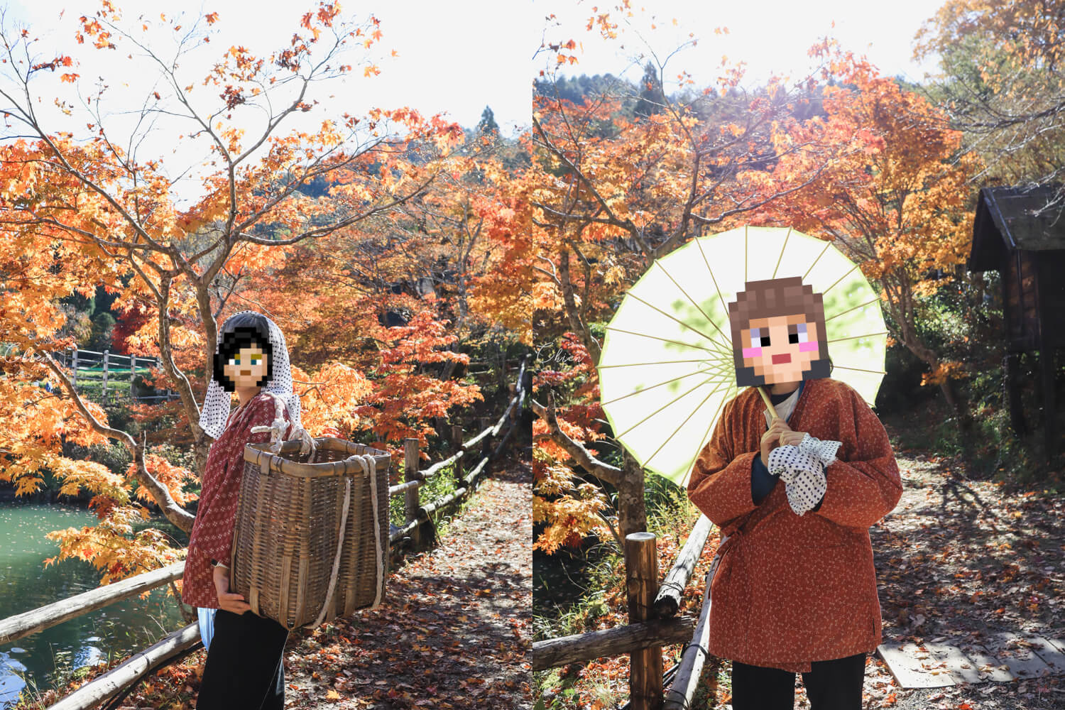 池子附近貼心地提供了服裝道具,讓大家都能輕鬆變身,入境隨俗(?)穿上服裝的媽媽立刻化身農家姑娘,在橙紅的楓葉下撐起紙傘哈哈笑,拿著相機的我趕緊捕捉這自然的畫面。