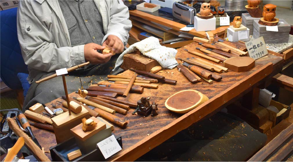 那天,我們在舊小林家內欣賞了「一位一刀雕刻」,技術純熟的職人僅用簡單的工具刻著品質良好的一位木,過程中不上色加工,利用木頭原有的紋路與色彩,表現出精湛工藝。當時,職人手上拿著新雕刻出來的作品跟我們說:一位一刀彫是值得時間考驗的工藝品。時間久了之後,木頭會發出自然光澤,顏色也會有所改變。聽到這樣,突然有點心動要不要挑個象徵好運的貓頭鷹或是不倒翁回家,但想到旅程才剛開始,在行李空間的考量之下還是先忍住了。