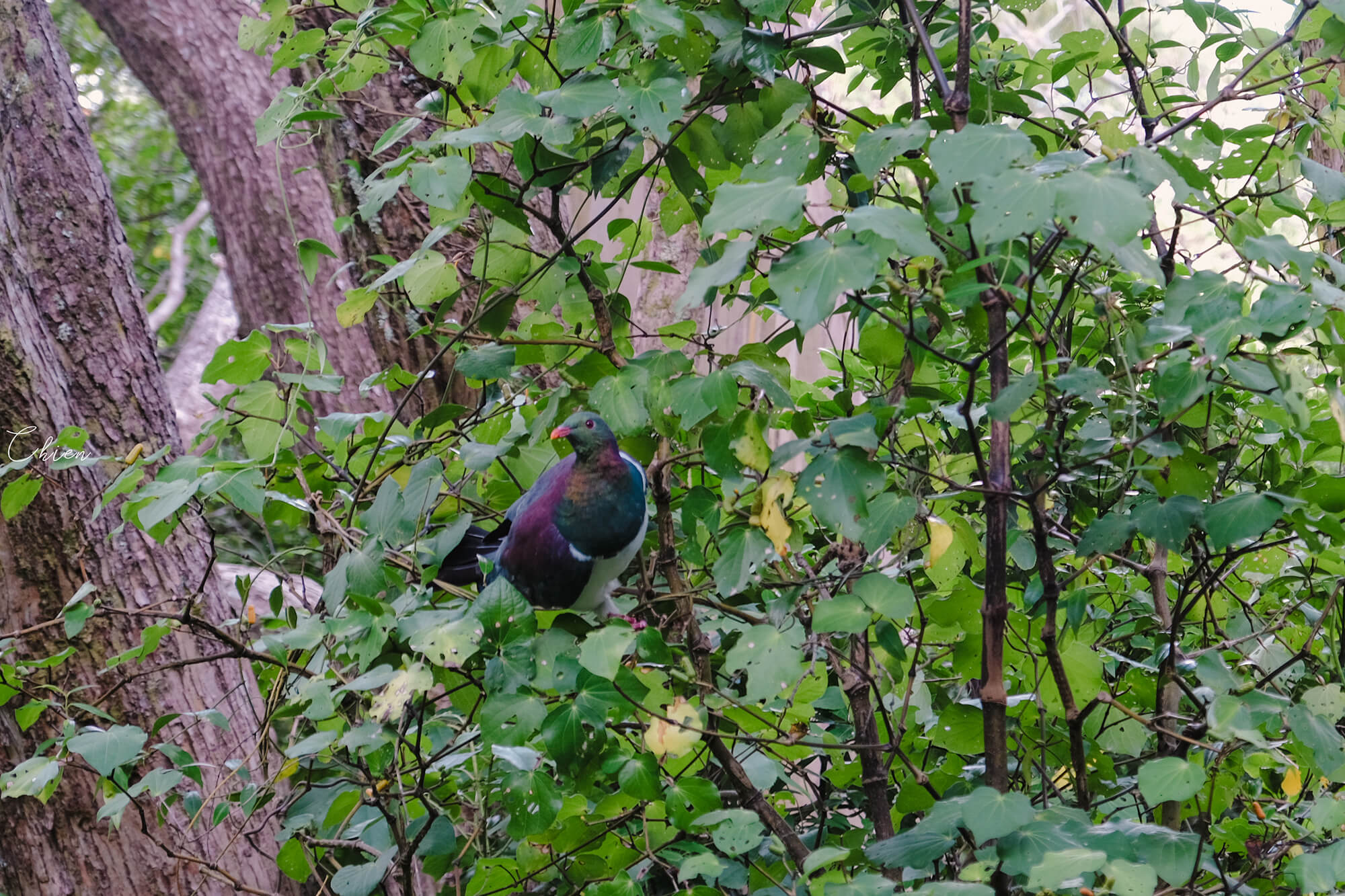 正當我陶醉於百花盛開的景象,眼前突然閃過了紐西蘭鴿子 Kererū 的身影。 Kererū 比一般的鴿子還要大得多,毛色也很特別,在陽光下的照射下更發出如寶石般美麗的色澤。雖然對於紐西蘭居民來說,要見到Kererū 應該不難,但對於我這樣的遊客來說,能見到野生的 Kererū 是很幸運的事。(延伸閱讀: 紐西蘭威靈頓⎮Zealandia 西蘭蒂亞生動植物保護區 )